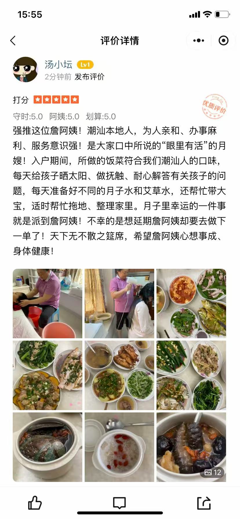 詹蘇紅姐姐來自廣東饒平,是個地道的潮汕地區(qū)月嫂,為人本分,做事勤快,與人為善,助人為樂。她在日常生活中對照顧寶寶和寶媽有一定的護理經驗,寶寶護理專業(yè)度非常強,在護理產婦方面也很到位、細心貼心、支持媽媽們成功母乳喂養(yǎng)。她做的月子餐種類多樣,色香味俱全,讓人有食欲,非常有潮汕的風味,廚藝非常棒,服務過的家庭都紛紛夸贊我們的紅姐?。?!